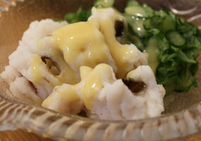 湯引きにして谷さん特製辛子酢みそで食べましたが白身と皮の食感の美味さに箸が止まりませんでした。